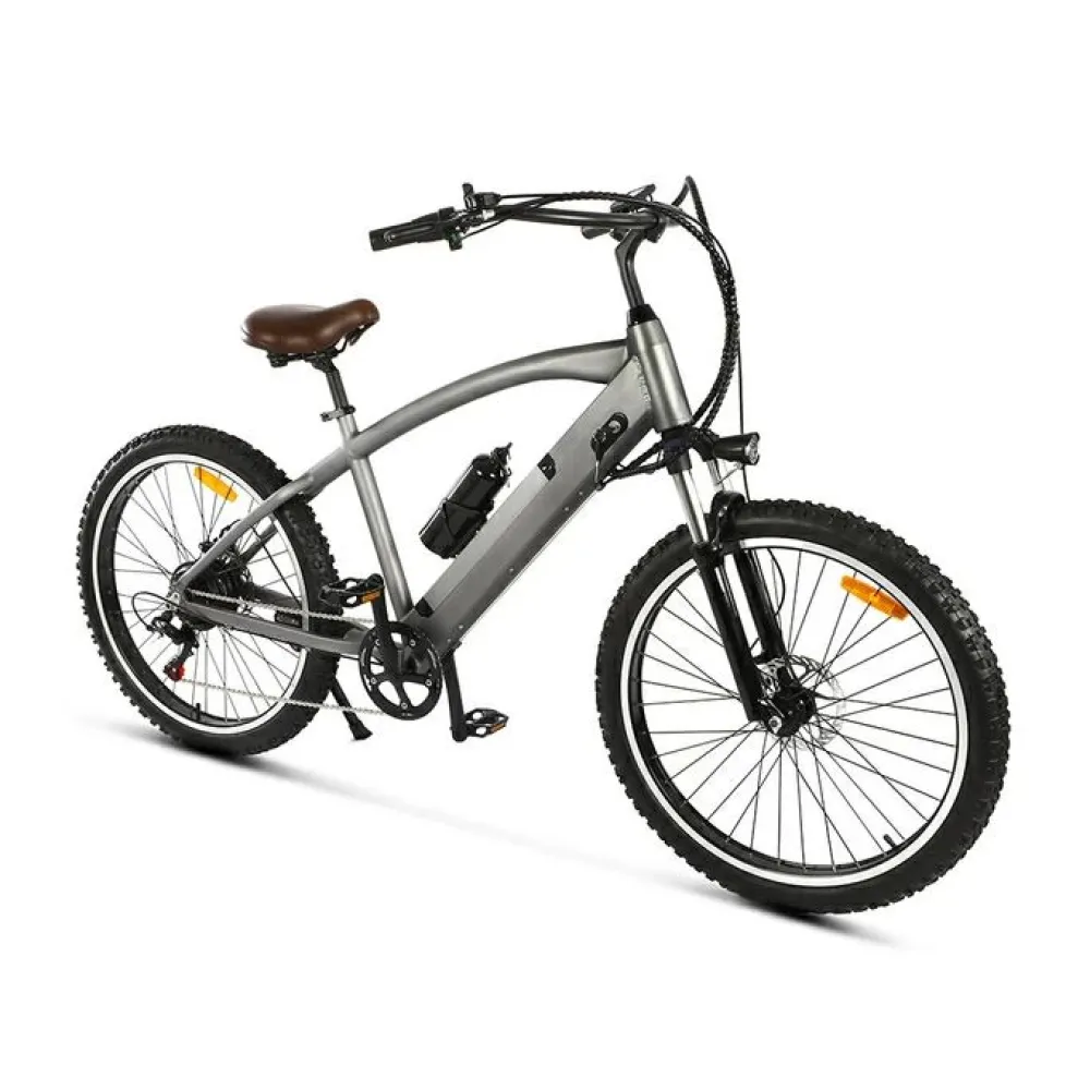 Модель изготовлена из инновационного ударопрочного алюминия. Рама – высока, цельная, с плавными изгибами удобная для длительного время провождения. Емкая батарея встроена в раму. При массе 23 кг электробайк рассчитан на грузоподъемность 120 кг. 26-дюймовые колеса без труда преодолевают по бездорожью, накатистые и устойчивые. Наличие евровилки минимизирует дискомфорт при передвижении по кочкам и ямам. Фирменная тормозная система гарантирует экстренное своевременное торможение.