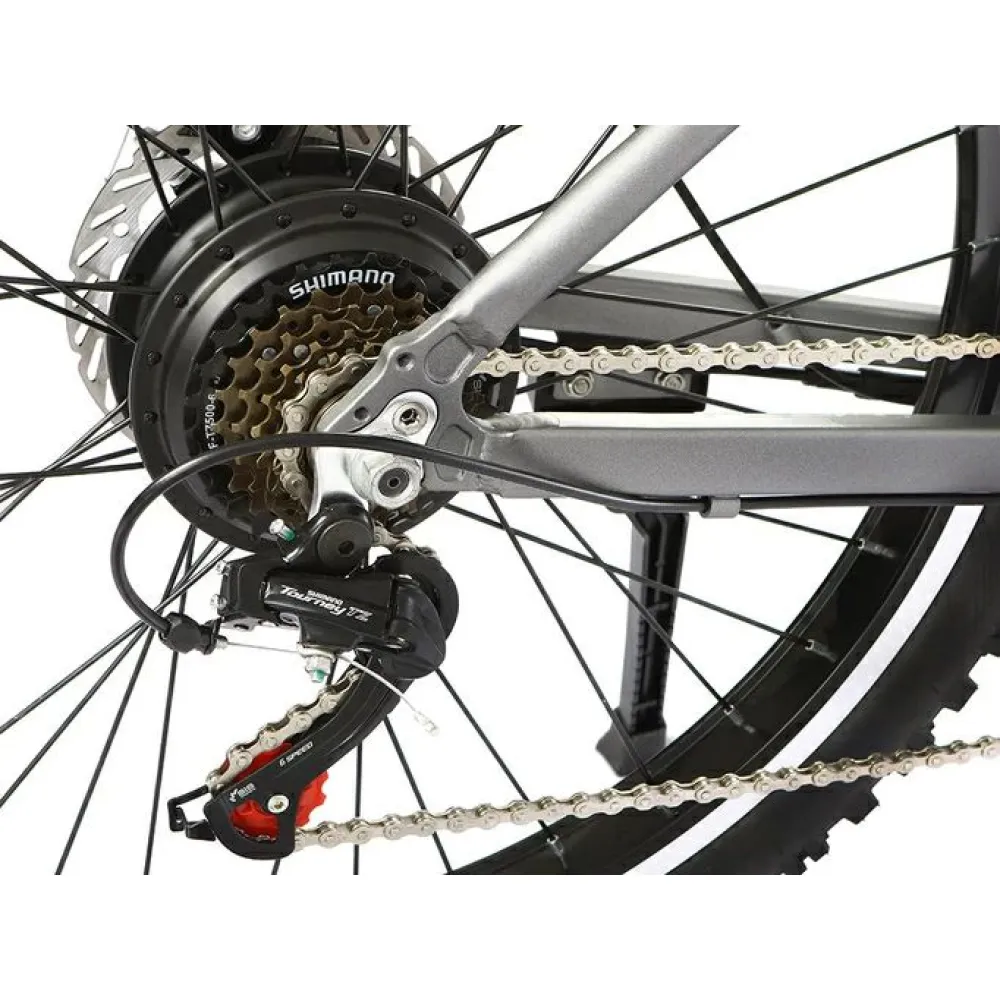 Заднеприводная модель оснащена двигателем мощностью 350 Вт. Максимально возможная скорость со слов производителя составляет 35 км/час, запас хода – 50 км. Увеличить пробег можно за счет чередования электрорежима с педальным.  Анатомическое мягкое седло регулируется по высоте, не вызывает усталости, не провоцирует проблем с позвоночником. Трансмиссия с 6 скоростями переключается с помощью половинчатой ручки. Контроль и безопасность райдера, риск форс-мажора в пути организуется и исключается благодаря фирменному бортовому компьютеру. Надеемся, вам понравился велогибрид. Предлагаем сделать заказ прямо сейчас.