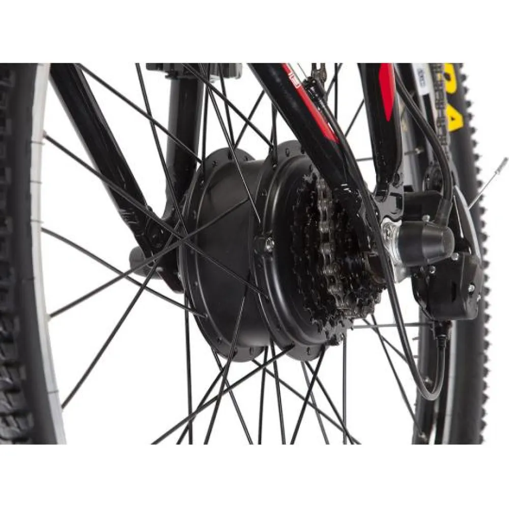 Электровелосипед Eltreco Impulse EM 502 оборудован редукторным двигателем мощностью 300 Вт, он позволяет набирать равномерное ускорение и имеет экономное энергопотребление. Максимальная скорость транспортного средства 25 км/ч. Ободная тормозная система регулирует движение. На бездорожье амортизированная передняя вилка смягчает вибрацию. Литий-ионный аккумулятор емкостью 9 А*ч позволяет проехать на одном заряде 35 км пути при полной нагрузке. Он легко снимается с посадочного места. Зарядное устройство, идущее в комплекте, необходимо подключить на 6 часов для пополнения заряда до 100 процентов.